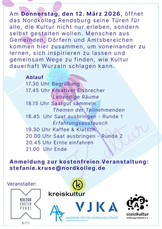 Am Donnerstag, den 12. März 2026 öffnet das Nordkolleg seine Türen für alle, die Kultur nicht nur erleben, sondern selbst gestalten wollen. Menschen aus Gemeinden, Dörfern und Amtsbereichen kommen zusammen, um voneinander zu lernen, sich inspirieren zu lassen und gemeinsam Wege zu finden, wie Kultur dauerhaft Wurzeln schlagen kann.