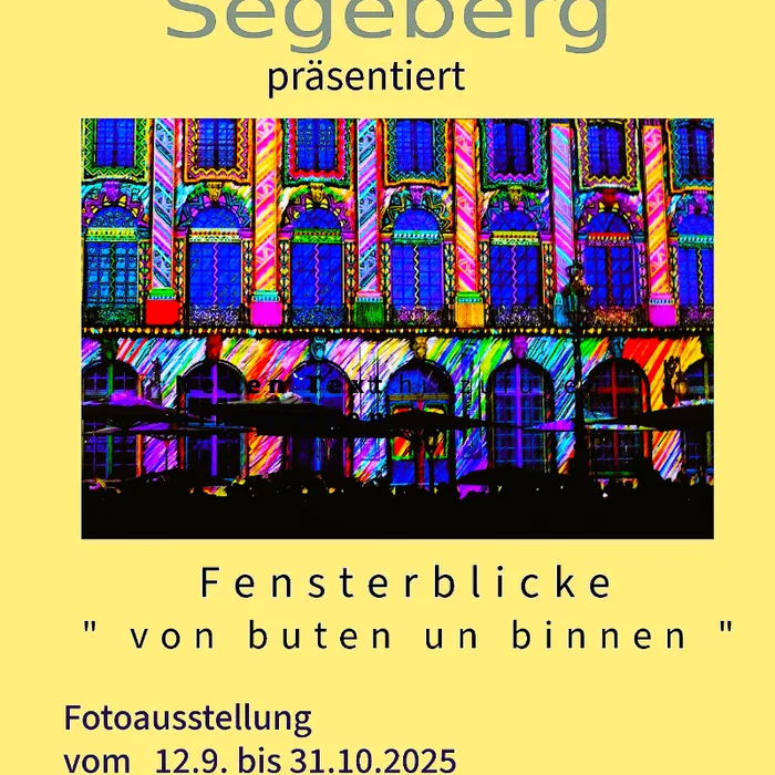 Vom 12.9. bis 31.10.2025 zeigen Mitglieder des Fototeams Segeberg zum Thema Fenster " von buten un binnen" großformatige Bilder. Es zeigen sich unterschiedliche Arten und Weisen, das Thema darzustellen. Dazu wird zusätzlich mit freien Themen in einer Bilderschau Fotos aus dem Fundus der Mitglieder gezeigt.
