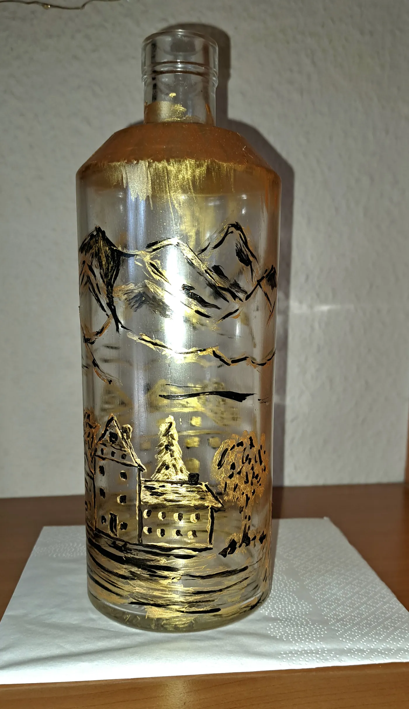 Material wird gestellt, eigene Flaschen können aber auch mitgebracht werden. Zum Schluß bekommt die Flasche auch noch eine Lichterkette.