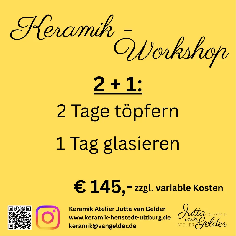 Kursgebühr € 145,- pro Person zzgl. Ton-, Brenn- und Glasurkosten in Höhe von € 20,- pro Kilogramm fertig gebrannter Keramik