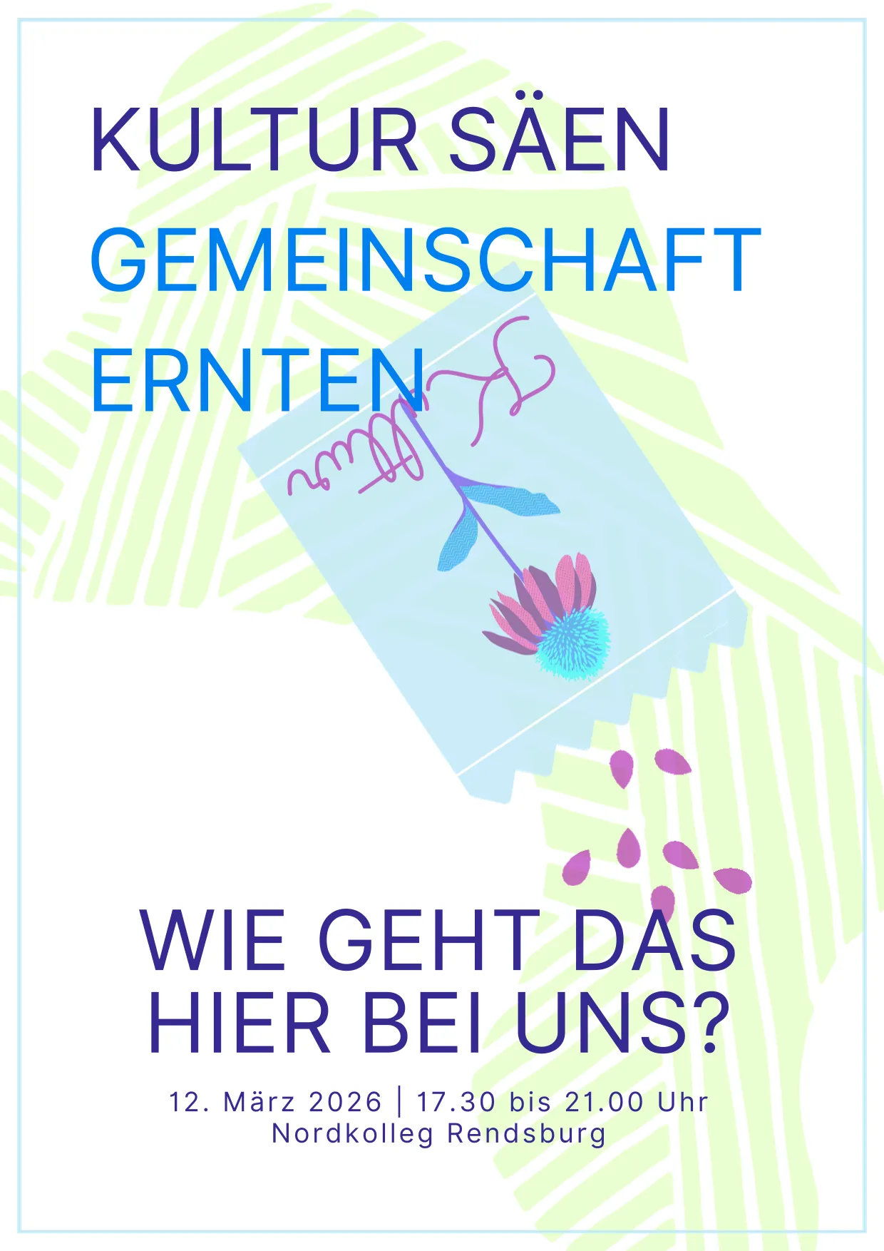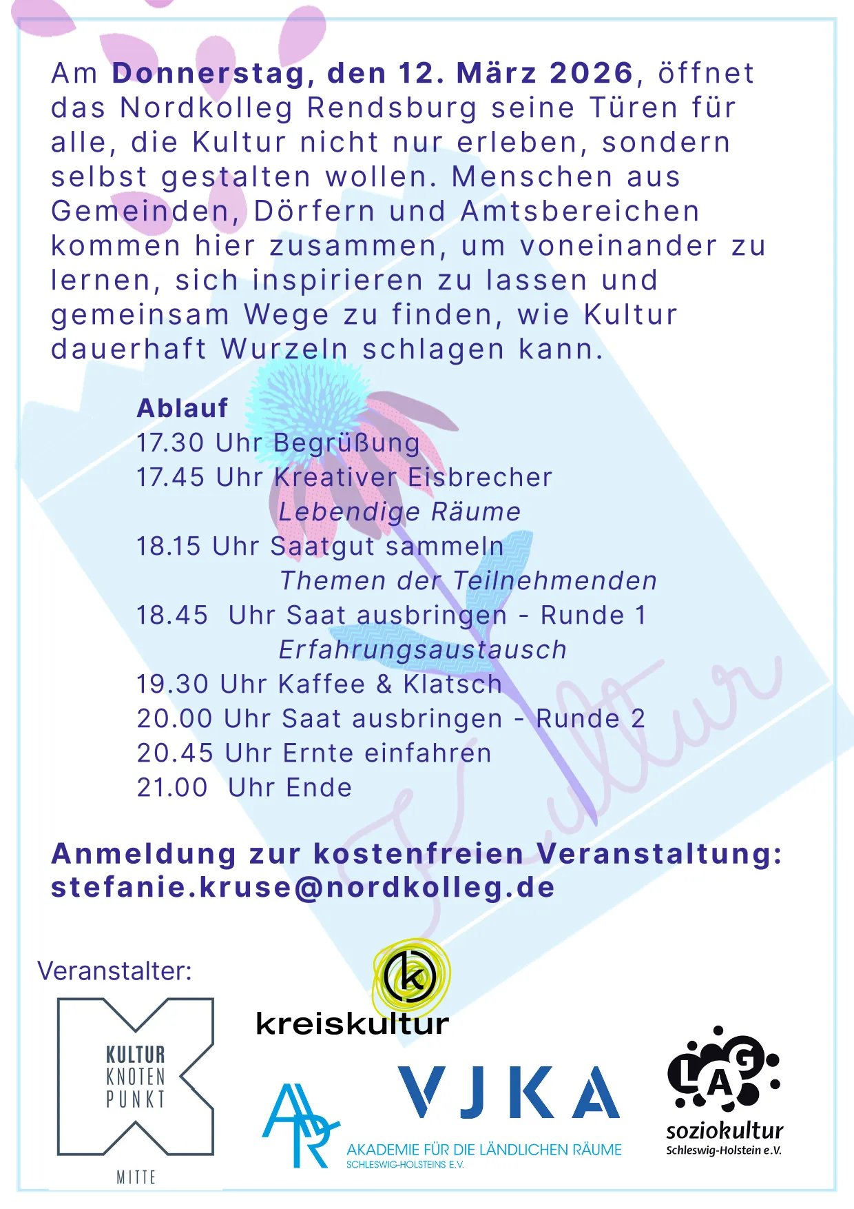 Am Donnerstag, den 12. März 2026 öffnet das Nordkolleg seine Türen für alle, die Kultur nicht nur erleben, sondern selbst gestalten wollen. Menschen aus Gemeinden, Dörfern und Amtsbereichen kommen zusammen, um voneinander zu lernen, sich inspirieren zu lassen und gemeinsam Wege zu finden, wie Kultur dauerhaft Wurzeln schlagen kann.